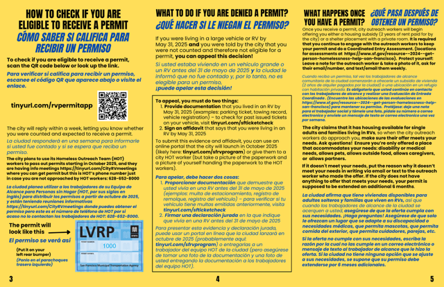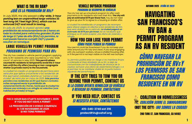In July 2025, the City of San Francisco passed a citywide 2-hour parking restriction that effectively bans RV parking. This will impact over 1,400 people living in their vehicles in San Francisco. According to the 2024 Point-In-Time Count, 90% of families experiencing unsheltered homelessness live in their vehicles. With the shortage of affordable housing, many individuals and families have no choice but to live in RVs.