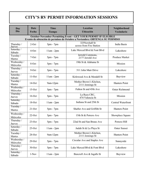 White document – A schedule of the city’s information sessions where residents can learn about the permit program, ask questions, and register for permits if they haven’t been offered one
